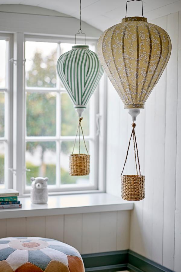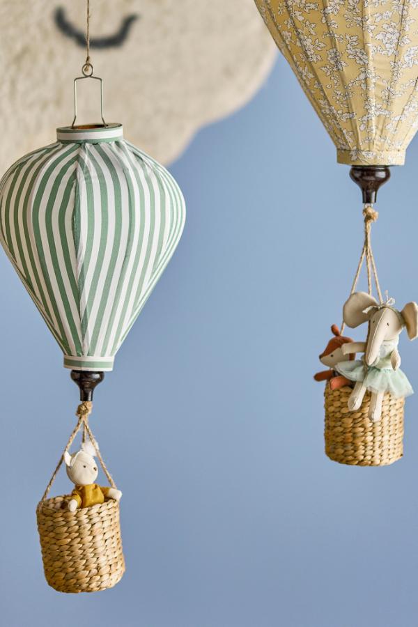 Lekka forma balonu wykonana z poliestru została uzupełniona koszyczkiem z naturalnego materiału, co nadaje dekoracji ciepły i przytulny charakter. Idealnie sprawdzi się zawieszony nad łóżeczkiem, w kąciku zabaw lub jako element dekoracyjny ściany.