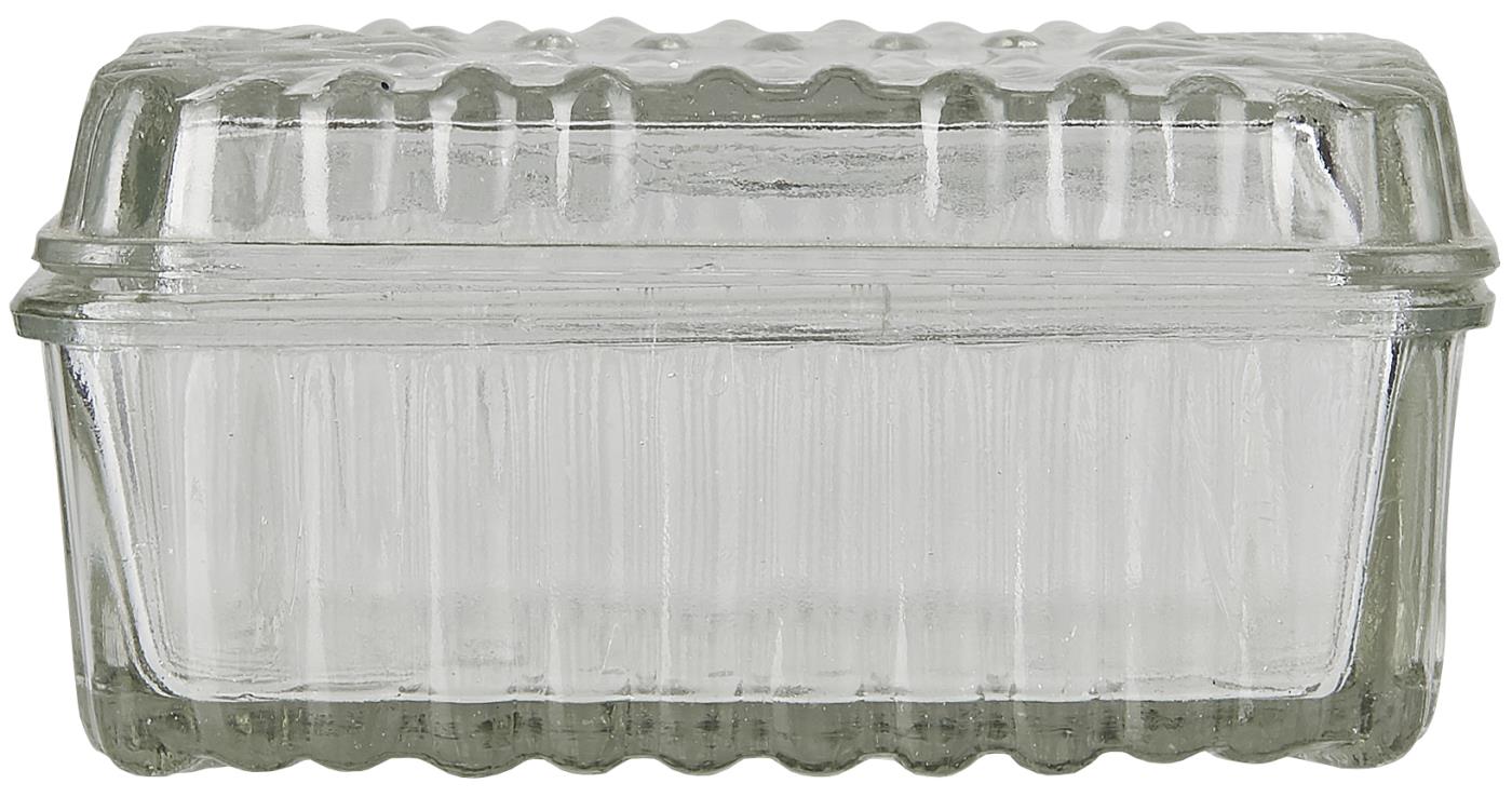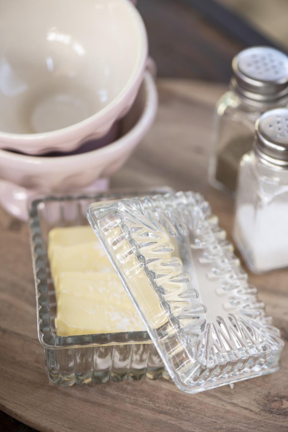 Szklana maselniczka ze wzorem. Odpowiednia do przechowywania masła i wygodna w użyciu.