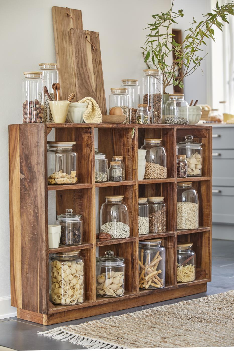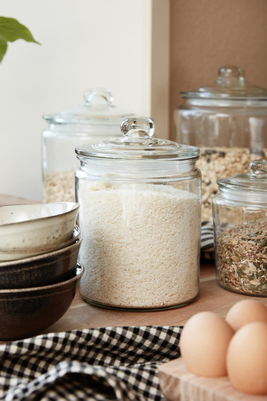 Szklany słój z gumową uszczelką. Idealny do przechowywania musli, kasz, ryżu czy suchych przekąsek, np. ciasteczek. Stojąc w kuchni na blacie, jest ciekawym elementem jej wystroju.
