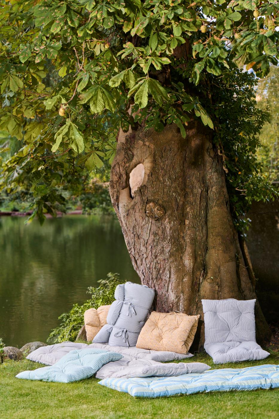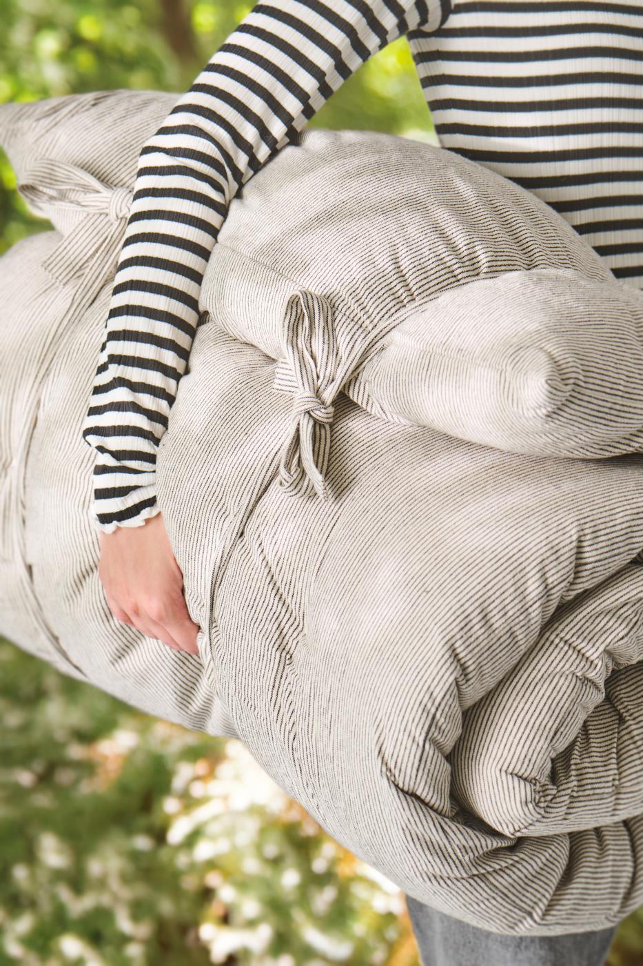 Materac Lina długi marki Ib Laursen z cienkimi czarnymi paskami to dwustronny materac wykonany w 100% z bawełny z miękkim wypełnieniem z poliestru, zapewniający wygodę i przytulną atmosferę. Materac posiada grube wypełnienie i miękką bawełnianą tkaninę, co tworzy komfortowe miejsce do siedzenia lub relaksu. Można go używać na łóżkach dziennych, ławkach lub bezpośrednio na podłodze, a gdy nie jest potrzebny, łatwo go zrolować.